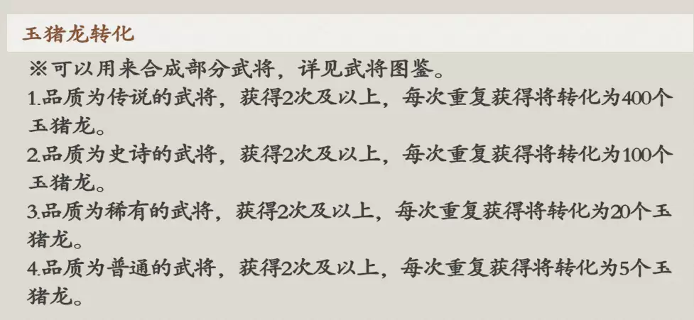 当玩家在招募中抽到2次或以上相同的武将时,这些重复的武将会根据其自身品质,自动转化为“玉猪龙”道具。使用“玉猪龙”可以直接合成你想要的特定武将。具体哪些武将可以通过合成获得,还需要玩家在游戏内的武将图鉴中仔细查看了解。