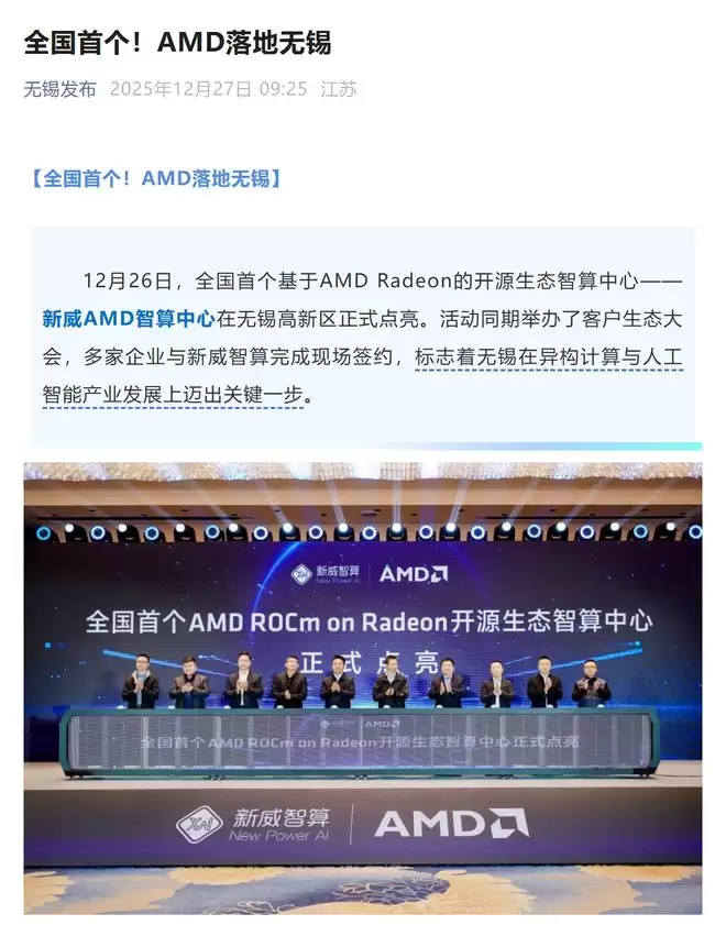 据IT之家12月27日消息,全国首个基于AMD ROCm开源生态的智能计算中心,已于昨日(26日)在无锡正式点亮并投入运营。