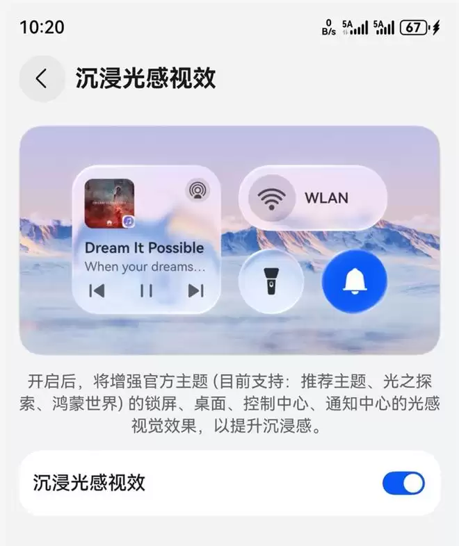 然后沉浸光感视效并不是主题,是仅在最新主题下生效,因为立体图标包就那一套,并且第三方主题的锁屏、耳机弹窗等界面样式不一。