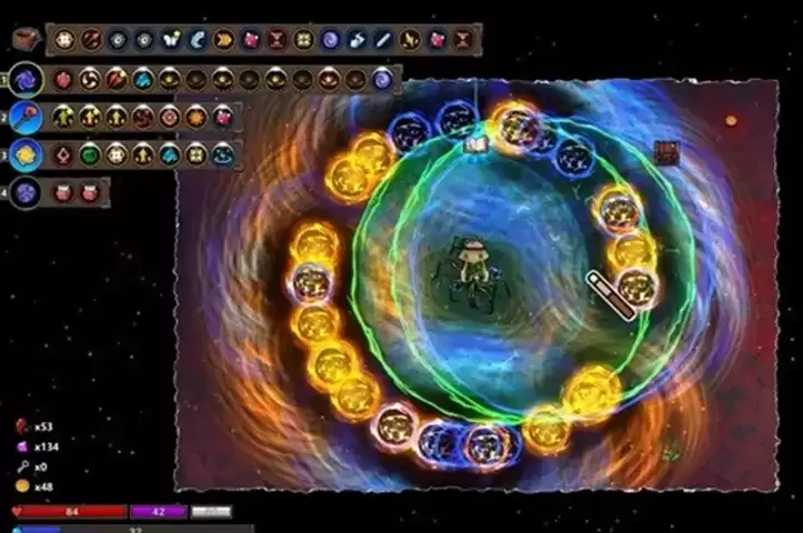 《魔法工艺》中的“公转黑洞流”以其独特的黑洞为核心机制,通常搭配法杖“小行星”共同构建一套体系。在构筑流派时,需要堆叠“拟态魔方”与“烈焰核心”等增伤组件,并加入冰冻效果以补充控制能力。该流派的蓝耗相当高,必须依赖能够回复法力值的法杖来维持运转,因此对装备配置的要求较为苛刻;一旦成型,则能展现出强大的聚怪能力与持续输出潜力。