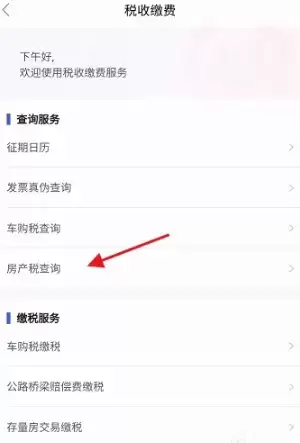 进入税收缴费页面后,在下方的服务列表中找到“房产税查询”入口,点击即可进入并查看您的房产税详细信息。