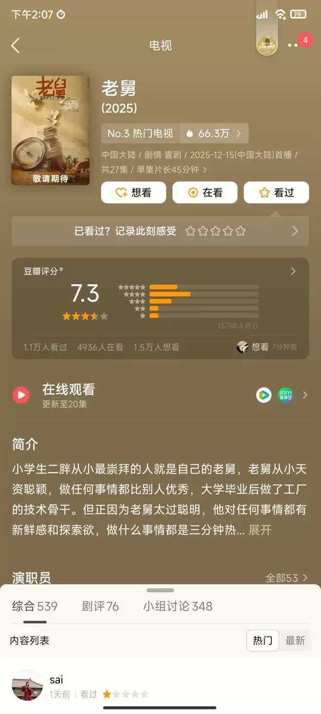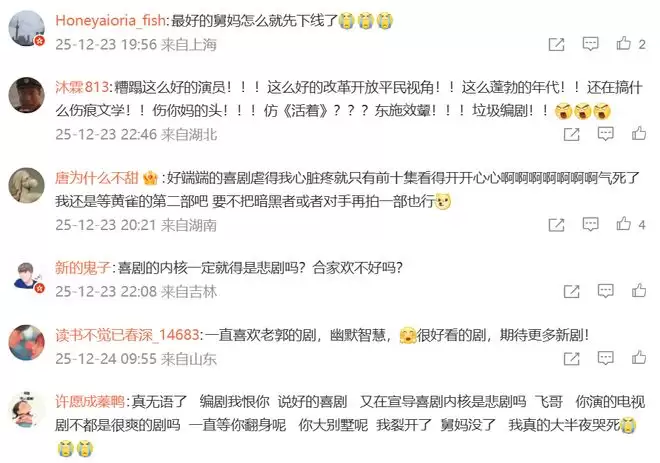 郭京飞的评论区可被骂惨了,都在舍不得舅妈,最好的舅妈下线了,气死了,要给编剧寄刀片。还说郭京飞接了个烂剧,原本还以为明年能凭借《老舅》拿奖的,舅妈去世后风评变了,都说这剧情糟蹋了演员,喜剧的内核就一定是悲剧吗?为何不能改原著改得彻底一点?这部剧本来开分有7.6分的,短短几天已经降到7.3分了。
