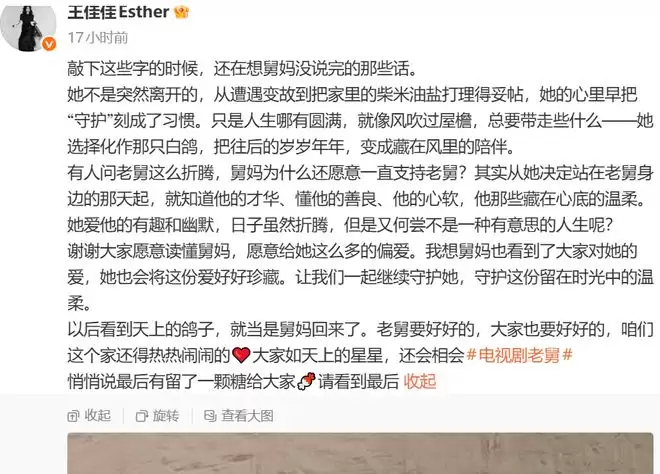 最后王佳佳还感谢了观众,谢谢大家愿意读懂舅妈,给她这么多的偏爱。还说以后看到天上的鸽子,就当是舅妈回来了。希望老舅和大家都要好好的,这个家还得热热闹闹的。并且还劝大家不要弃剧看到最后,说最后留了一颗糖给大家,请看到最后!