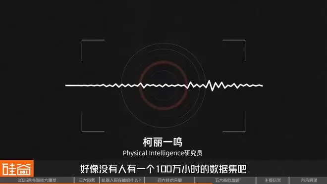 柯丽一鸣 Physical Intelligence研究员 一个人的一生假设是100年的话,大概我们很粗略的算就是100万个小时,我觉得现在在我的目所能及或者我公开信息看到的范围里,好像没有人有100万小时的数据集,我是这么猜想的。 我会觉得什么时候我们能够收到100万小时等同于一个人一生的物理经验的数据,我觉得可能我们才开始后面的探索。