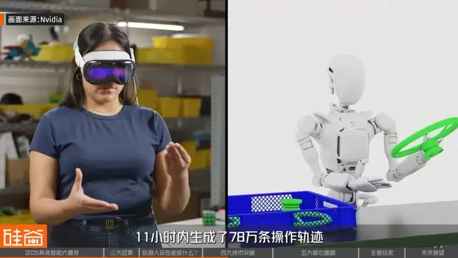 NVIDIA的解决方案是:用模拟器生成合成数据。他们展示过,11小时内生成78万条操作轨迹。相当于6500小时或连续九个月的人类演示数据。虽然合成数据和真实数据有差距,但至少解决了“数据荒”的燃眉之急。