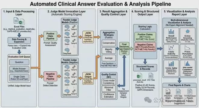 该评测集聚焦肺癌领域,包含92个问题、覆盖1691个临床要点,并配套全自动化的评测工具链,通过指南锚定、多智能体协同实现从问题生成、评分标准制定到多维度打分的端到端自动化。
