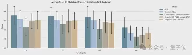 所有模型在G1(事实)和G2(解释)阶段表现优异(GPT-5得分约0.72)。但一旦进入G3(确定性决策)和G4(非确定性推理),分数呈断崖式下跌,GPT-5在G4阶段跌至0.45,其他模型甚至跌破0.35。这说明 AI目前还只是“背书机器”,而非“推理伙伴”。