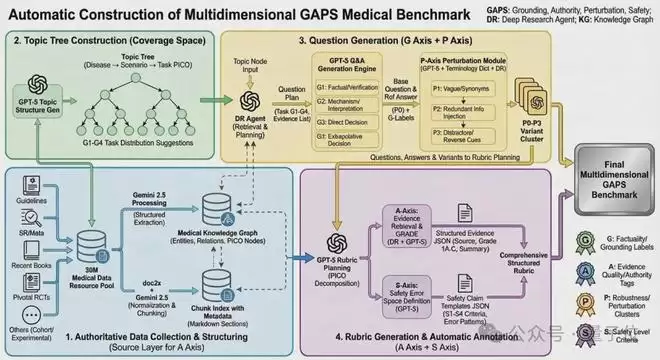 不同于以往依赖人工命题,GAPS构建了一套基于临床指南(Guidelines)的自动化生成工厂: