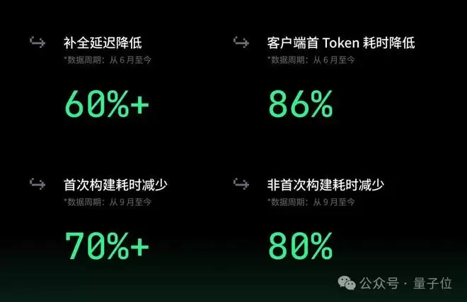 补全延迟降低了60%+。客户端首Token耗时降低了86%。内存占用降低了43%(Windows设备评测)。网络错误数减少60%,补全成功率达到了恐怖的99.93%。