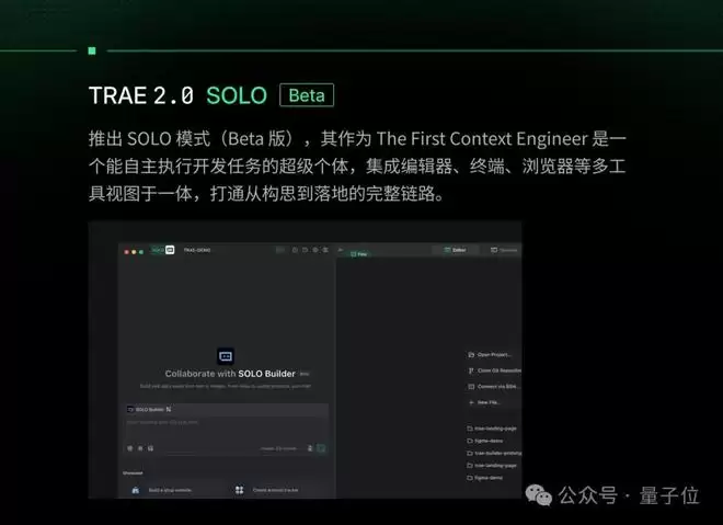 推出了SOLO模式的Beta版。这时候,TRAE开始像是有了独立人格,被称为The First Context Engineer。它集成了编辑器、终端、浏览器,试图打通从构思到落地的链路。