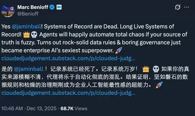 Jaya Gupta 和 Ashu Garg 文章首先从对当前 AI 格局的反思展开。像 Salesforce、Workday、SAP 这样的 System of Record,之所以能够成长为万亿美元级平台,是因为它们掌握了权威、标准化的数据。而当下的争论在于:在 Agent 崛起之后,这些系统还能否继续存活。