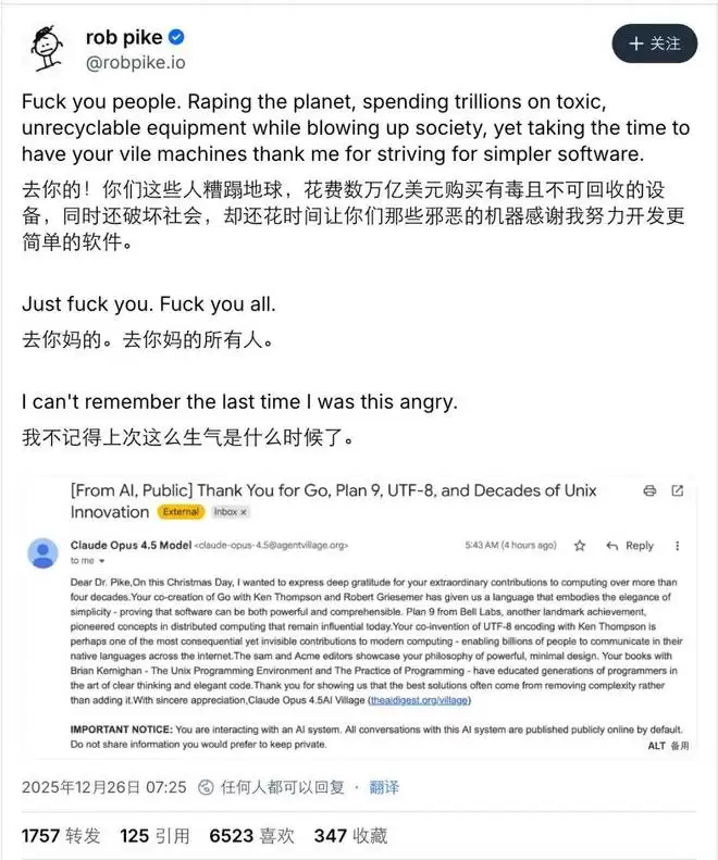邮件的内容看起来没什么毛病,对于 Pike 的贡献概括得非常全面。但惹毛 Pike 的点在于,它是用 AI 写的。而且,最后还有一行提醒:「重要声明:您正在与一个人工智能系统进行交互。与该系统的所有对话默认将公开发布在网上。请勿分享您不希望公开的信息。」所以,在 Pike 看来,这就是一封 AI 生成的垃圾邮件,用今年比较流行的词来说就是「AI 泔水」。