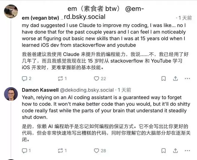 还有人觉得,用 AI 写代码之后,自己的基本功退化得厉害。