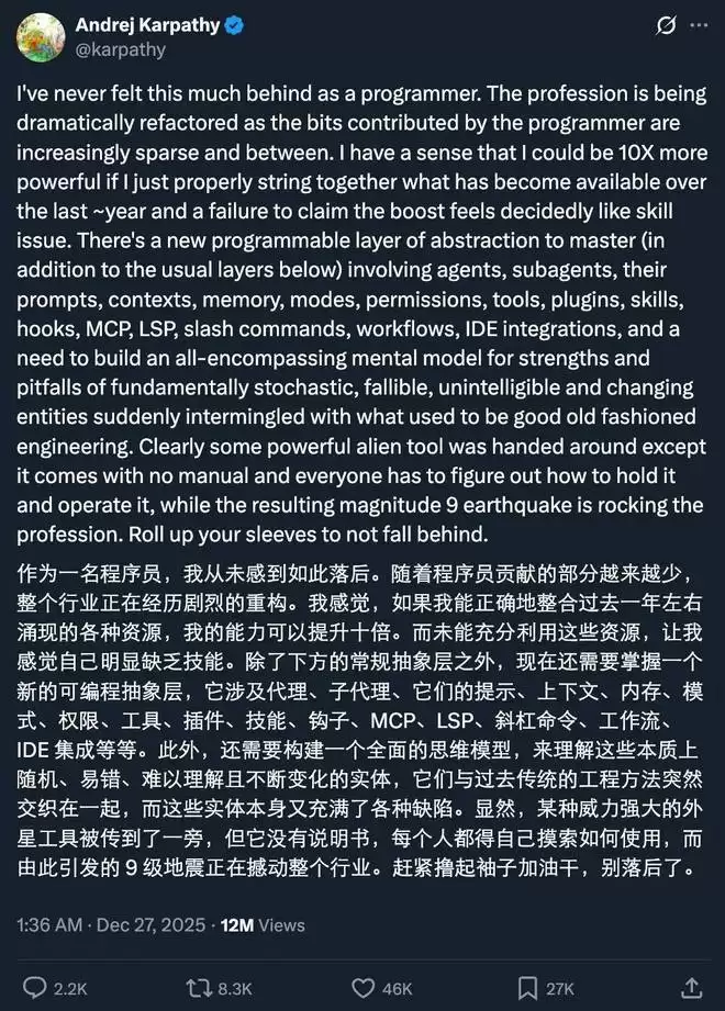 不过,最近 Andrej Karpathy 的帖子揭露了一个境况 ——AI 模型确实给程序员群体带来了一些恐慌。就在几个月之前,Karpathy 还说,AI 智能体的成熟还需要十年。但昨天他却说,「作为程序员,我从未感到如此落后」。