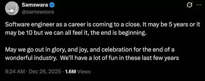 甚至 X 博主 @samswoora 发出了「软件工程师这个职业即将 over」的感慨。「可能是 5 年,也可能是 10 年,但我们都能感觉到,结束已经开始了。」