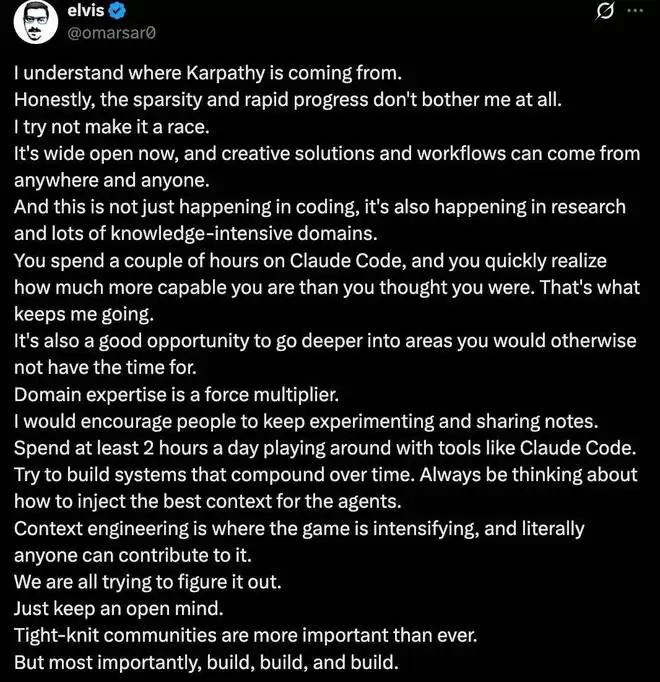 X 博主 @omarsar0 持更乐观、放松的态度。他认为,代码越来越稀疏和 AI 进步飞速并不困扰他,因为他不把这当成「竞赛」。相反,现在领域完全开放,创意解决方案和工作流可以来自任何人、任何地方,这种变革不只限于编码,还发生在研究和其他知识密集型领域。他建议大家别焦虑,每天玩 2 小时工具、多实验、多分享、重点想怎么给 AI 喂好上下文,然后拼命 build 项目。