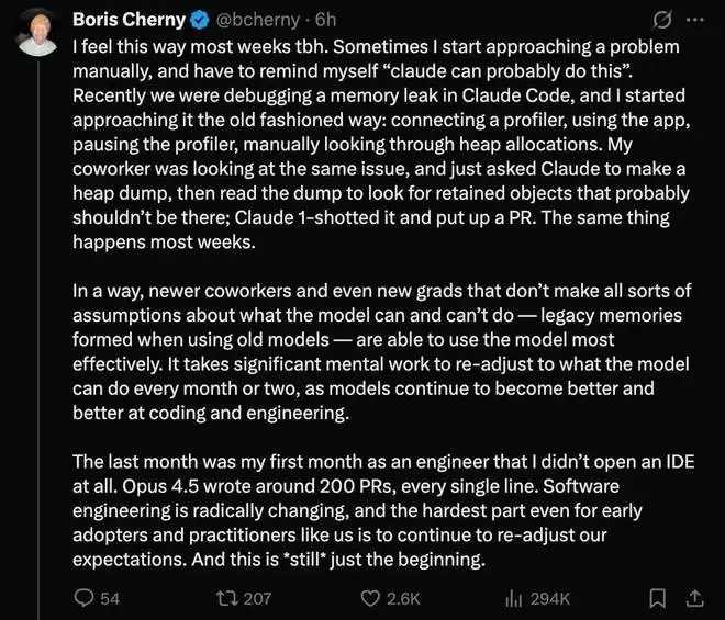他表示,每隔一两个月都需要投入大量心理努力来重新调整对模型能力的认知,因为模型在编码和工程方面不断进步。上个月,他作为工程师第一次完全没打开 IDE,全靠 Opus 4.5 写了约 200 个 PR,每行代码都是 AI 生成的。