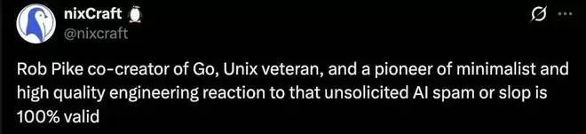 有网友完全理解并支持 Rob 的态度,这种 AI 批量生成的劣质代码和垃圾邮件确实令人反感,尤其对像 Rob 这样追求极致简约、纯净工程的老派极客来说,简直是侮辱。