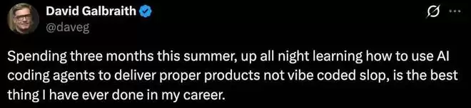 技术专家和风险投资家 David Galbraith 表示,「今年夏天花了三个月时间,通宵达旦地学习如何使用 AI 编码 Agent 来交付真正高质量的产品,而不是那种随性编码的垃圾货,这是我职业生涯做过的最棒的事。」
