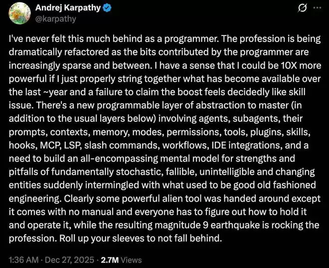 刚刚,Andrej Karpathy 在 X 上发的一条帖子,引发数万程序员和从业者强烈共鸣与热议。