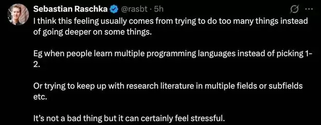 《Build a Large Language Model From Scratch》也挺看得开,大家现在普遍焦虑技能「落后」问题,通常来自于试图同时做太多事情,而不是在某些事情上深入钻研。比如,有些人学好几门编程语言,而不是专精 1-2 门。或者试图同时跟进多个领域 / 子领域的研究文献…… 这本身不是坏事,但确实会让人感到压力很大。