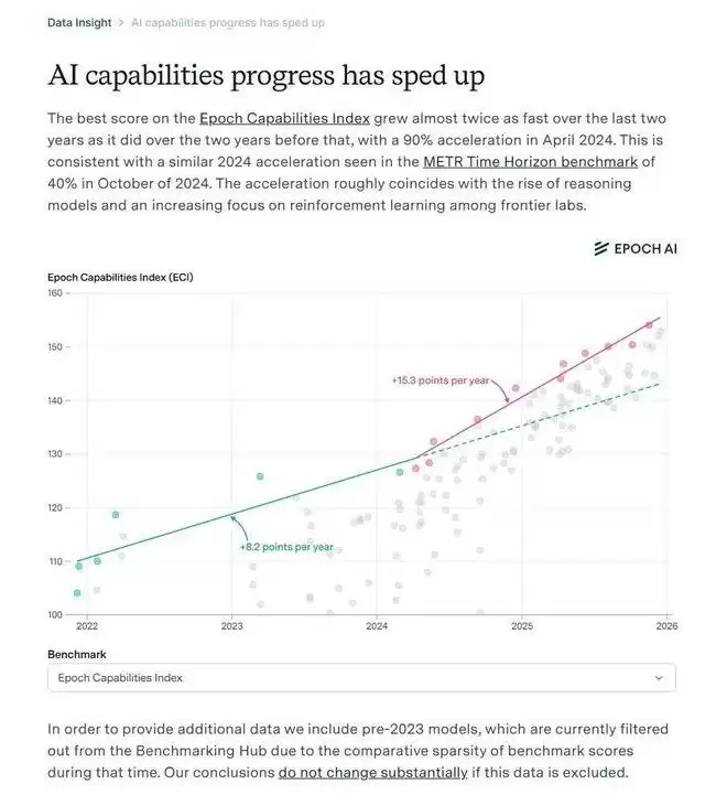 据 Epoch AI 的数据显示,Epoch Capabilities Index (ECI,一个衡量 AI 通用能力的综合指标) 在过去两年增长速度几乎是前两年的两倍,2024 年 4 月更是加速增长了 90%。