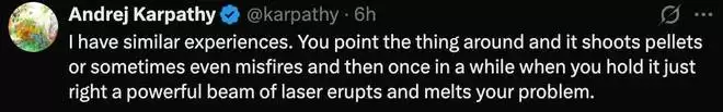 Karpathy 打了个比方来解释这种感觉,就像你拿着 AI 四处瞄准,它会发射弹丸,有时甚至会哑火,但偶尔当你握住它的角度恰到好处时,一道强大的激光束会突然爆发,瞬间帮你解决问题。