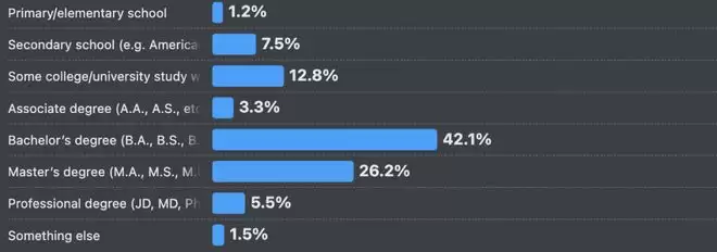 在今年正在学习编程的人群中,已拥有理学学士(BS)学位的比例达到30%,较去年的24%有明显提升。