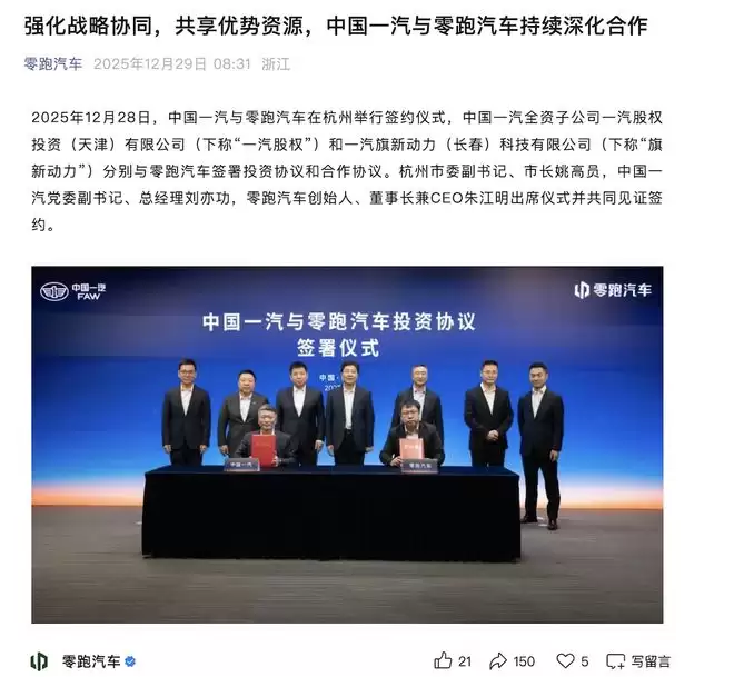 中国一汽全资子公司一汽股权投资(天津)有限公司(下称“一汽股权”)和一汽旗新动力(长春)科技有限公司(下称“旗新动力”)分别与零跑汽车签署投资协议和合作协议。