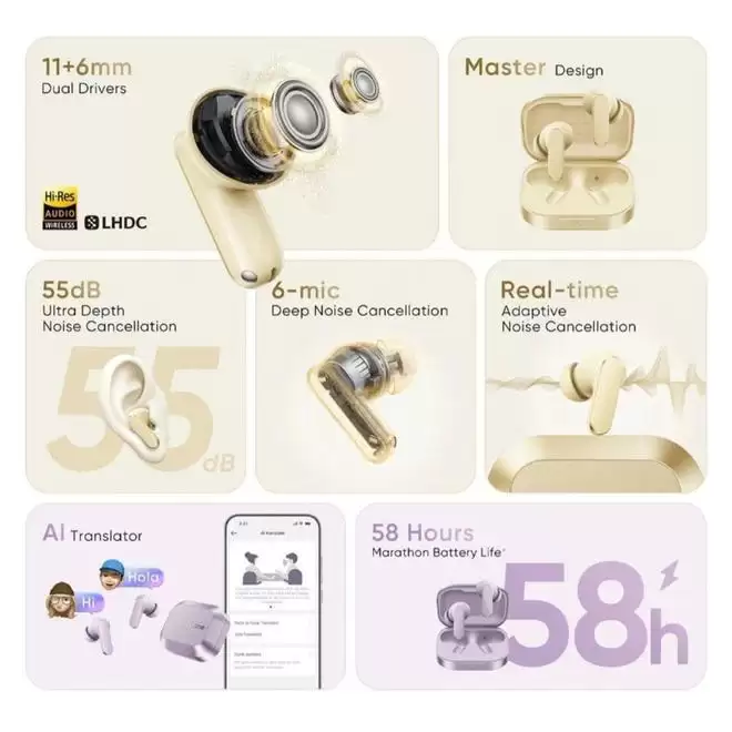 IT之家注意到,这款耳机在开启降噪的情况下,综合续航时间可达58小时。此外,它还支持AI翻译等多种实用功能,并搭载了LHDC无损解码器。