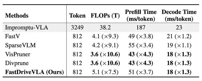 从算力开销来看,FastDriveVLA对冗余信息的修剪堪称“暴力”。在nuScenes基准测试中,VLA模型的整体算力开销(FLOPs)从原始的38.2T骤降至5.1T,整整实现了7.5倍的缩减。