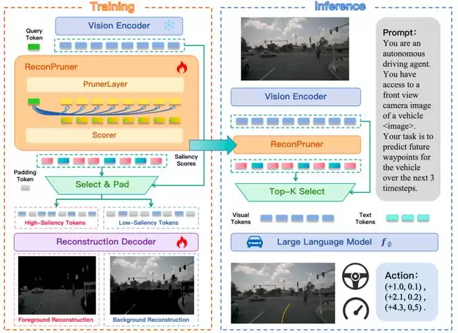 能实现上边的这种效率的提升,离不开ReconPruner这个参数量仅为0.07B的微型模块。如果说VLA模型是整车智驾的“大脑”,那么ReconPruner就是一个敏锐且轻量化的视觉中枢。