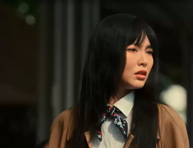 戴着假发套,还是没遮住膨胀的苹果肌和外翻的嘴唇,狰狞的表情怎么看也不像清纯的小妹。