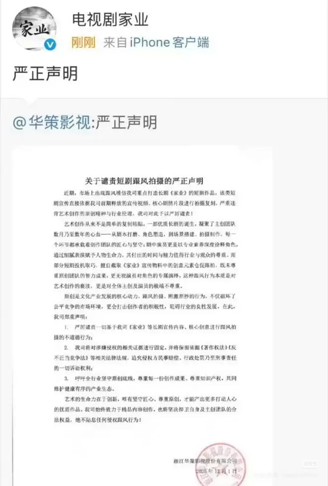 12月1日,《家业》出品方华策影视发布严正声明,表示已固定涉嫌侵权的相关证据,将依法追究责任,并准备好了96页诉状和5张公证光盘,同时提出了一千万元的索赔金额。