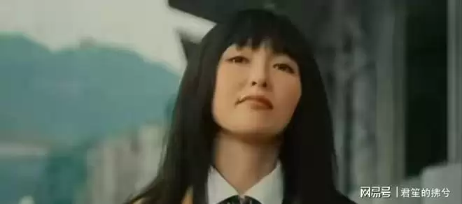 齐刘海,学生装,但和她脸部的状态完全不搭。