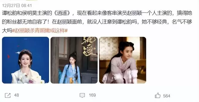 这样的情况出现,让赵丽颖的粉丝都感到非常尴尬,虽然赵丽颖来客串,给这部剧带来巨大的关注度,但这部剧的热度不能完全靠她,要知道谭松韵已经出道20年了,侯明昊出道10年了,他们两人都不是内娱的新人,结果最新大量地宣传赵丽颖,看到这样的情况,很多网友都忍不住问:这么不信任谭松韵的扛剧能力吗?