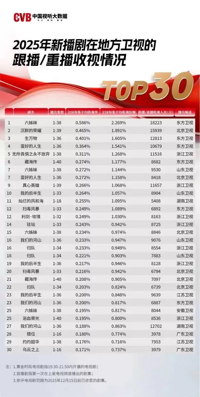 真正的精品,其价值绝不限于首播的“爆响”。2025年的数据显示,《六姊妹》《沉默的荣耀》《生万物》等剧在总台首播大获成功后,在省级卫视的重播依然能跻身收视榜单前列,甚至登上回看规模榜首。
