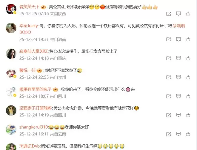 胡明告别黄公杰,“以贪念换虚名,时势轮转终是泡影。今晚看黄公杰还将有何手段!”黄公杰演得太坏了,评论区全是气惨了的评论,让人恨得牙痒痒,还有人建议他和浩二最近少出门,低调点,太招恨了。