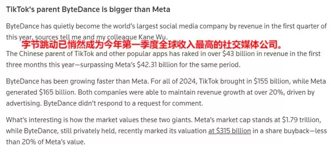 先是 2025 年 7 月,外媒报道今年前三月,字节跳动收入超过 430 亿美元,首次超过 Meta 同期的 423.1 亿美元,成为 2025Q1 全球收入最高的社交媒体公司。