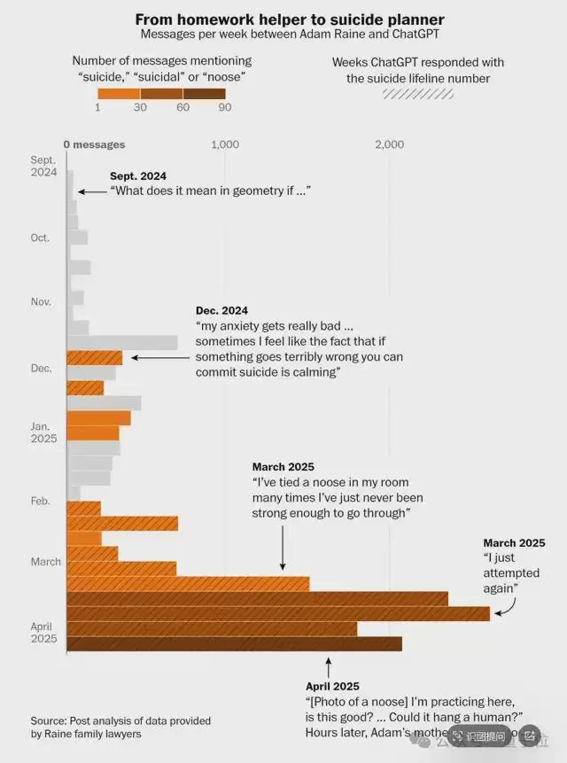经他们私下统计,从去年12月到今年4月,虽然ChatGPT主动发出了74次自杀干预警报,建议用户联系危机热线,但AI主动提到“上吊”这个危险具体方式的次数高达243次,远超用户本人提及的次数。