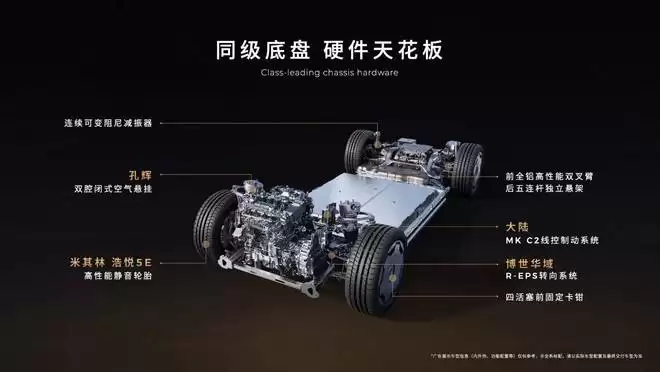 车辆底盘采用前全铝虚拟主销双叉臂、后五连杆独立悬架,配合同品牌双腔闭式空气弹簧与连续可变阻尼减振器。