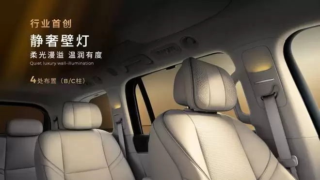 D19 车内还配备了智能香氛系统,提供三种香型与三档浓度调节;氛围灯则采用漫反射技术,支持 1600 万色无极调光,并在 B 柱与 C 柱新增了 4 处壁灯,并在二三排标配航空级阅读灯。