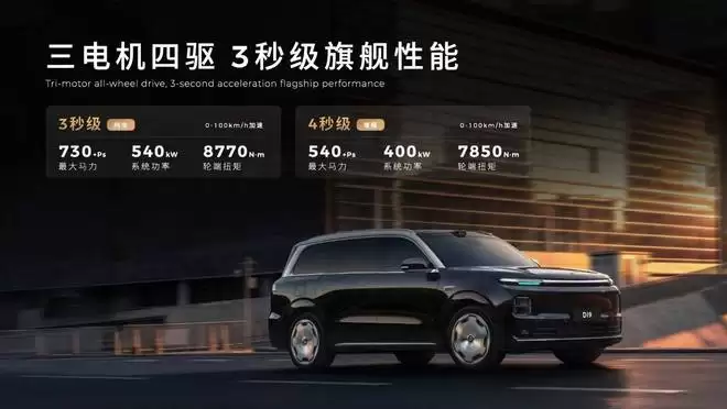 驾控性能方面,D19 纯电版采用三电机四驱布局(前后双电机+中间轴向电机),系统总功率 540 kW,轮端扭矩 8770 N·m,百公里加速 3 秒左右。增程版系统综合功率 400 kW,零百加速约 4 秒。