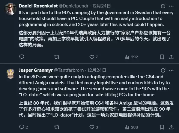 在社交平台X上,有网友好奇为何瑞典能在游戏界如此活跃?一位用户回应道:“因为上世纪九十年代末,瑞典政府颁布了一项政策,致力于让每个家庭都拥有一台电脑,并大力推行计算机编程课程。”
