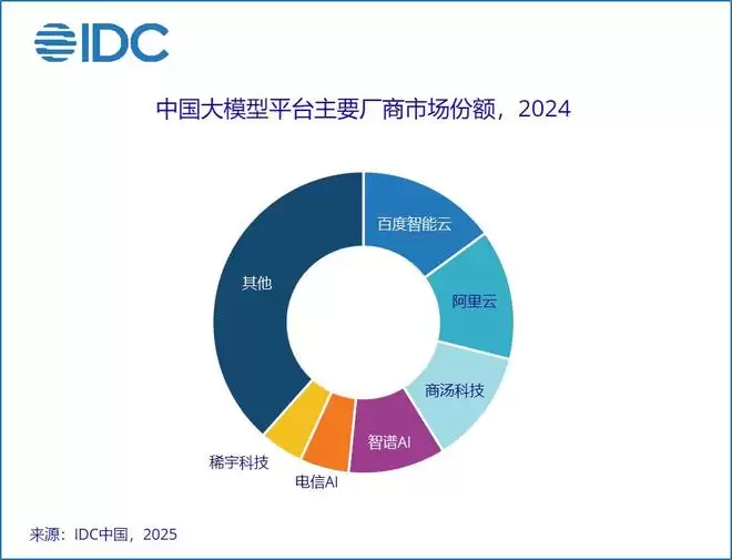 IDC的报告显示,2024年中国大模型平台主要厂商市场份额(统计口径与弗若斯特沙利文报告类似,都是狭义的“平台”市场)的排名是:百度智能云(第一)、阿里云(第二)、商汤科技(第三)、智谱AI(第四)。