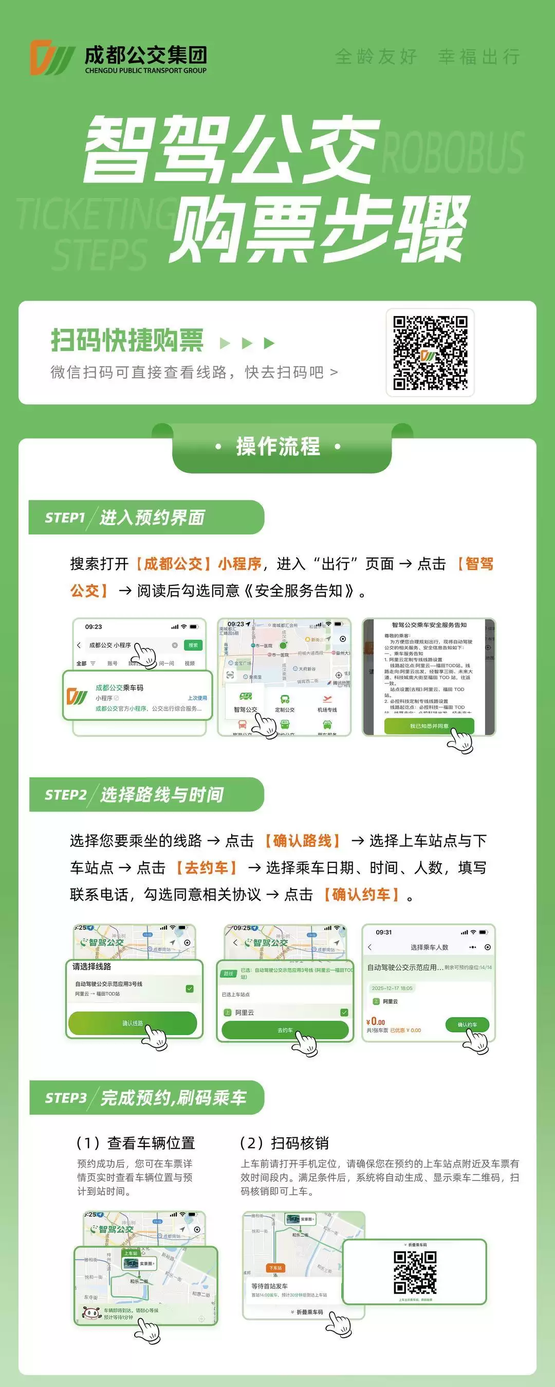 据相关负责人介绍,该线路采用预约制乘车模式。市民可以打开成都公交APP或微信小程序,找到“智驾公交”板块,选择“自动驾驶公交1号线”并确认线路,选定上下车站点后点击“去约车”,依次填写乘车日期、时间、人数及联系方式,核对信息无误后点击“确认约车”即可完成预约。预约成功后,市民可在车票详情页实时查看车辆位置与预计到站时间,实现精准候车;上车前需打开手机定位,在预约站点附近及车票有效时间内,系统将自动生成乘车二维码,扫码核销即可顺利乘车。据了解,该线路运行前期实行免费乘坐。