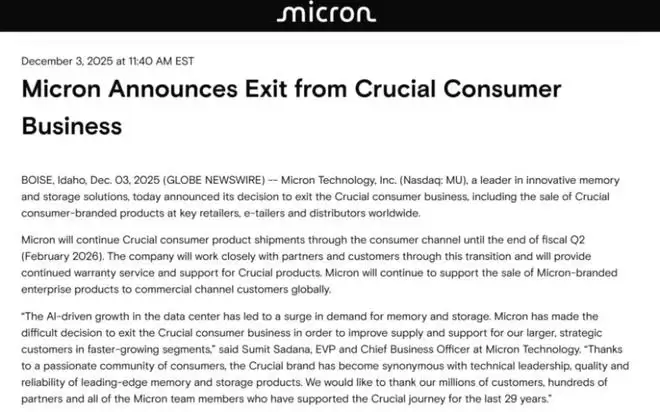 12月,美光宣布,决定退出Crucial(英睿达)消费级业务,包括在全球主要零售商、电商平台和分销商处销售英睿达消费品牌产品。美光方面表示,将通过消费渠道继续供应英睿达消费级产品,直至明年2月。