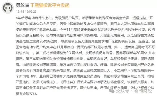 今年12月,哈啰电动自行车用户维权事件骤然升温。黑猫等投诉平台上,不少用户反馈称,购买的哈啰电动车因2G网络退网而失去远程控制、定位、电量显示等“智能”功能,并出现运行中断电或锁死等安全隐患。用户指出,这些功能是其购买或长期使用的主要理由,但如今需被迫自行承担升级成本或失去权益。