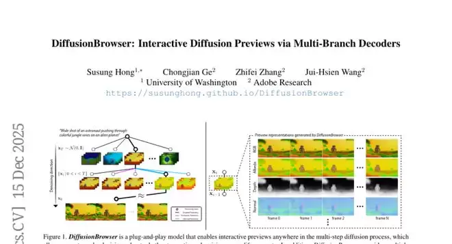 A:DiffusionBrowser是华盛顿大学和Adobe研究院开发的视频AI生成系统,它的核心能力是在视频生成过程中提供实时预览,让用户能够看到AI每一步在做什么,并可以随时进行调整。就像给黑盒子装上了透明窗户,用户不用再盲目等待最终结果。