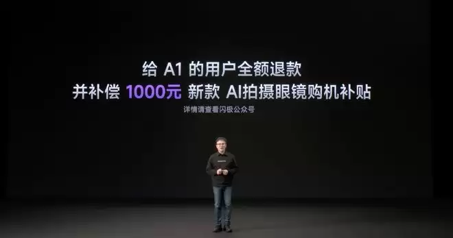 在发布这两款AI眼镜新品之前,闪极科技承诺向预定或者购买了闪极A1的老用户全额退款,并且补偿新机补贴1000元。